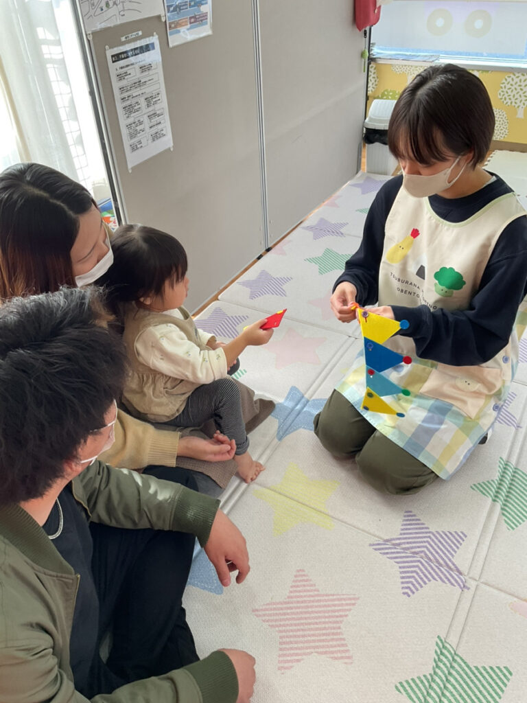 子どもたちは保育者から「さんかく△のパーツ」を貰うと「なにができるのかな?」とワクワク☆